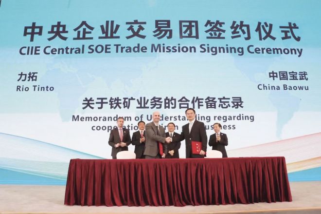圖為在第二屆中國國際進口博覽會上,寶鋼股份和力拓集團的代表簽署關於鐵礦業務的合作備忘錄。(本報資料圖片)