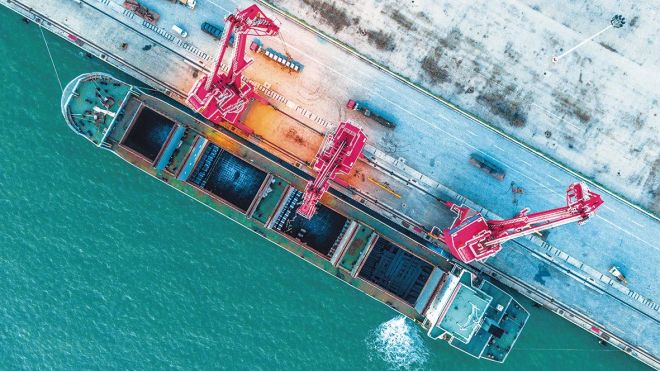 圖為2022年5月16日,首鋼京唐公司在京唐自有碼頭通過海運把產品發往客戶。 (通訊員 玄龍 攝)