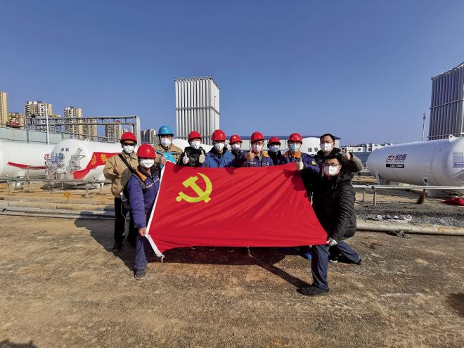 保產先鋒隊隊員在厚板部集控中心同吃、同住、同工,並對已經封閉的集控中心大樓進行消殺。“我們每天在黨旗下重溫入黨誓詞,抗疫保產已成為我們黨員的堅定信念。”一麵麵黨旗在鮁魚圈分公司各產線高高飄揚。