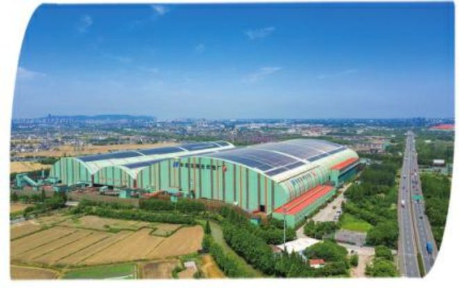 在從常熟市市區通往長江的高架橋途中,可以看到一大片牆體為綠色的廠房;聳立在廠區中間的高大煙囪以蔚藍色打底,上麵繪著潔白的雲朵;在廠房與廠房之間的空隙處,間或有樹冠探出屋麵;在秋季明媚的陽光下,橘紅色的屋麵熠熠生輝。