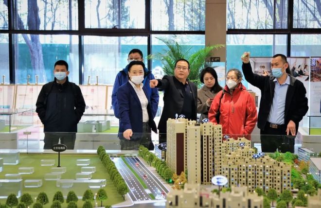 中國冶金報社報道組一行在國子郡銷售中心沙盤前調研采訪
