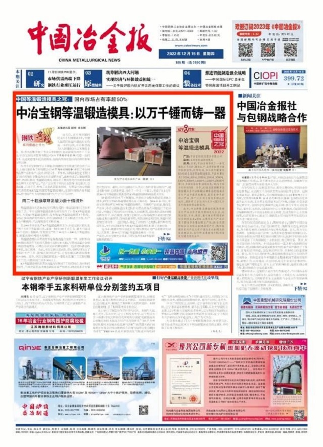 【中國等溫鍛造模具之冠】國內市場占有率超50% 中冶寶鋼等溫鍛造模具:以萬千錘而鑄一器