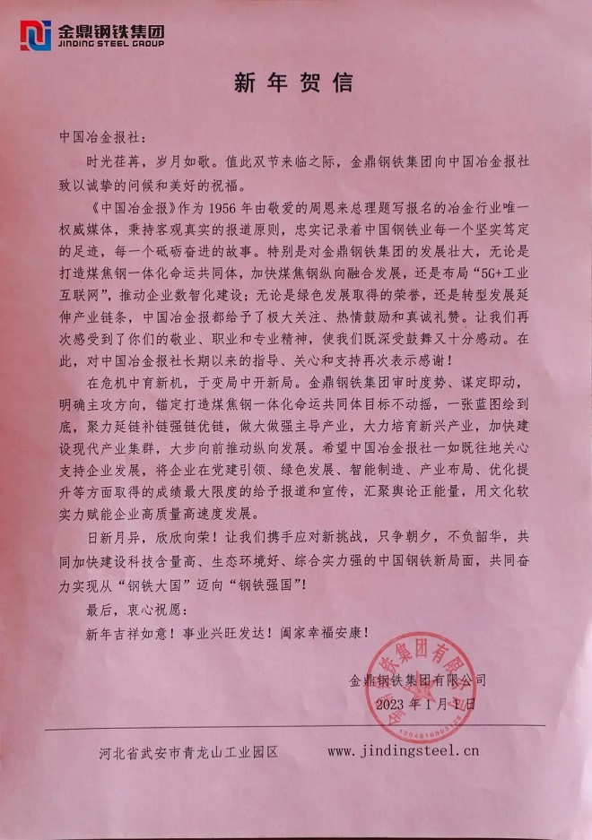 金鼎鋼鐵集團向中國冶金報社發來新年賀信