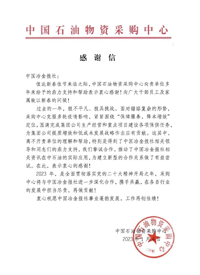 中國石油物資采購中心向中國冶金報社發來感謝信