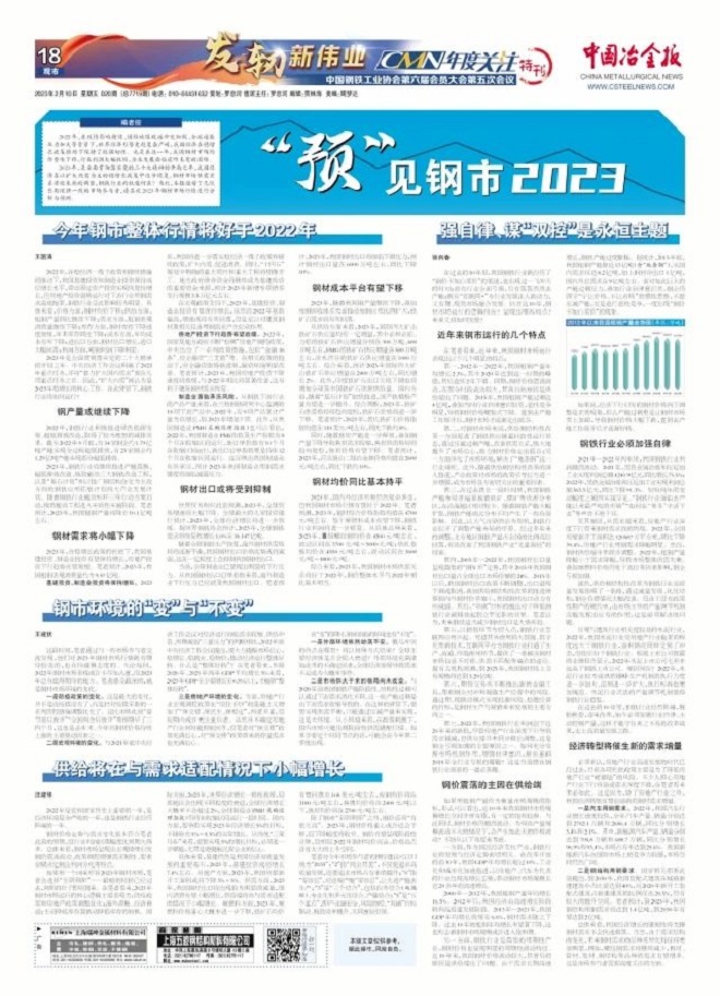 綜合來看,2023年,我國鋼材市場供需關係將好於2022年,鋼價整體水平與2022年相比基本相當。
