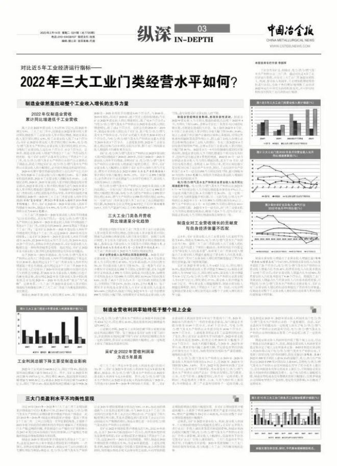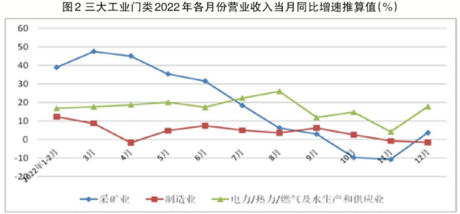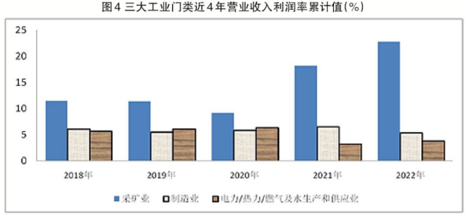 總體看,采礦業2022年營業收入、利潤、營業收入利潤率、工業增加值增速均出現超常態增長;受采礦業多數大類行業出廠價格上漲因素及需求轉弱的影響,製造業利潤出現較大幅度下降;電力/熱力/ranqijishuishengchanhegongyingyeshouchuchangjiageshangzhangyingxiang,yingyeshourudafuzengchang,danyinglishuipingyiranshoudaocaikuangyechuchangjiageshangzhangdezhiyue。sandamenleiyinglishuipingchuxianchayi,bujunhengxingyousuoxianxian。2023年需要理順三大工業門類的價格傳導機製,努力構建三大工業門類均衡發展的態勢。