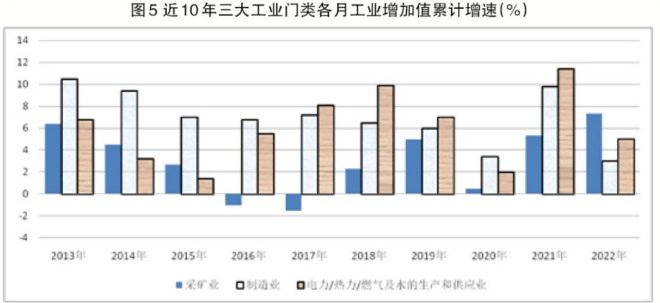 對近10年(2013年—2022年)三大工業門類工業增加值累計增速進行對比(見圖5)可知,自2017年起電力/熱力/燃氣及水生產和供應業增加值累計增速開始高於製造業。此前(2013年—2016年)製造業增加值累計增速一直高於其他2個工業門類。之所以出現這一差異顯著的現象,主要源於2015年底開始的供給側結構性改革較好地解決了多數製造行業產能過剩的問題,多數製造行業產能盲目擴張的勢頭在2017年及後續年份得到了較好的抑製,以產量增長為基礎的製造業增加值增速有所回落。