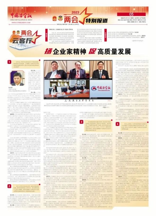 3月9日,《兩會雲客廳》邀請了來自鋼鐵產業鏈的多位全國人大代表參與此次論壇,圍繞“揚企業家精神 促高質量發展”話題聊心得、談體會,為鋼鐵產業鏈高質量發展建言獻策。
