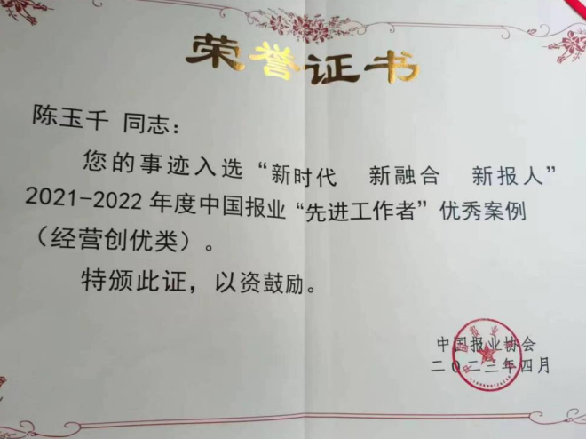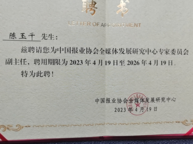 會上,還舉行了中國報業全媒體智庫授牌及聘任儀式,發布了“傳播中國 融合先行”倡議書,進行了中國報業先進工作者優秀案例分享及主旨演講。陳玉千被聘任為中國報業協會全媒體發展研究中心專家委員會副主任。