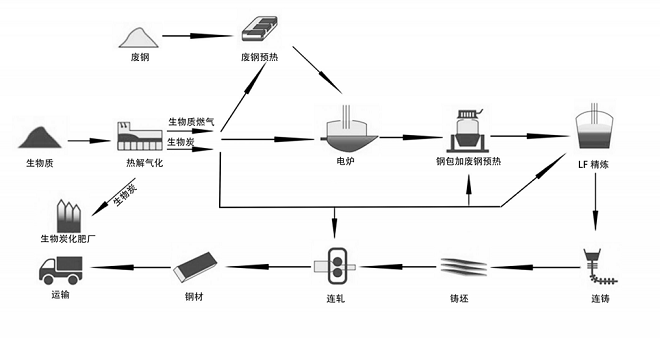 部分生物炭替代全部或部分化石輔助材料,如非生物源輔助材料增碳調碳劑、造渣劑及碳粉等,實現減排;剩sheng餘yu的de生sheng物wu炭tan進jin行xing生sheng物wu炭tan長chang期qi碳tan循xun環huan,其qi國guo際ji公gong認ren溫wen室shi氣qi體ti清qing除chu量liang抵di扣kou清qing除chu掉diao短duan流liu程cheng鋼gang鐵tie生sheng產chan中zhong不bu可ke避bi免mian剩sheng餘yu溫wen室shi氣qi體ti排pai放fang,實shi現xian從cong搖yao籃lan到dao大da門men生sheng命ming周zhou期qi碳tan中zhong和he。