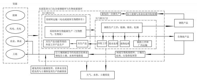 1.邊界係統擴展:將生物質熱解氣化-生物炭生產納入係統邊界內,全廢鋼綠電鋼工藝係統邊界由“從大門到大門,包括廢鋼循環”擴展到“從搖籃到大門,包含廢鋼循環與生物質燃氣生物炭(還田還林)碳循環”係統邊界,鋼鐵工業與農林業生態產業實現一體化。