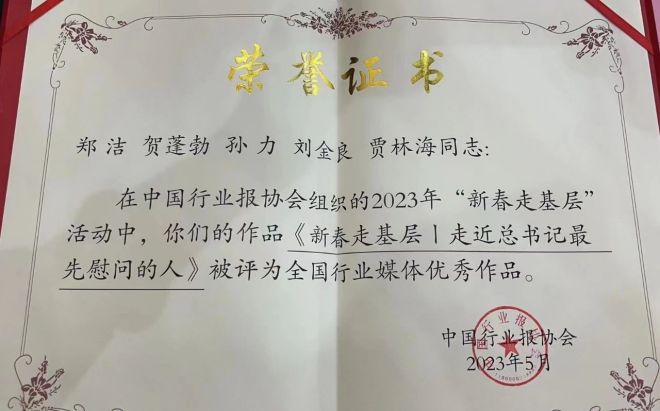 5月24日,中國行業報協會(以下簡稱行業報協)2023年第一次常務理事會暨“聚焦基層亮點 講好行業故事”2023年“新春走基層”活動表彰大會在京舉行。中國冶金報社報送,由鄭潔、賀蓬勃、孫力、劉金良、賈林海采編製作的作品《走近總書記最先慰問的人》被評為全國行業媒體優秀作品。