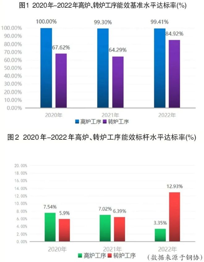 中國鋼鐵工業協會數據顯示,2020年—2022年,高爐工序達到能效基準值的產量占比分別為100%、99.3%、99.41%,達到能效標杆值的比例分別為7.54%、7.02%、3.35%;轉爐工序達到能效基準值的產量占比分別為67.62%、64.29%、84.92%,達到能效標杆值的比例分別為5.9%、6.39%、12.93%。可見,鋼鐵行業高爐工序達到能效基準值的產量占比均在99%以上,遠高於轉爐工序,但整體而言,各主體工序達到能效標杆值的比例,距“2025年能效達到標杆值的產能占比超30%”的政策要求有較大差距。由於高爐經濟爐料使用比例上升、節能技術創新不夠、精細化係統節能意識不足、工序能耗統計口徑存在差異等原因,推進主體工序能耗達標工作遇到一定挑戰。