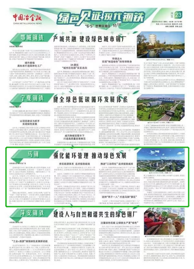 近年來,馬鋼深入學習貫徹習近平生態文明思想,積極響應長江大保護號召,堅決落實“雙碳”目標要求,以“大格局”踐行生態優先、以“大環境”帶動廠區周邊、以“大提升”打造靚麗名片,在提升生態環境、生產環境和生活環境質量上同步發力,實現了從生態治理向生態文明、從綠色製造到製造綠色、從自身改善到帶動周邊、從廠容廠貌到精神麵貌的“脫胎換骨”變化。