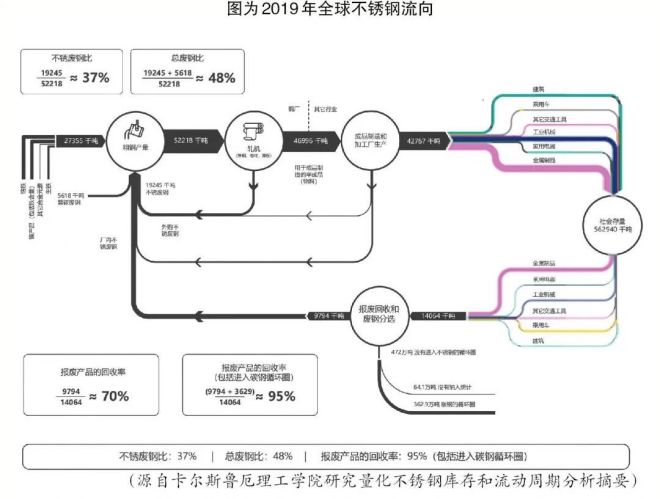 那麼,目前全球新生產不鏽鋼中廢鋼比是多少?不鏽鋼的回收利用率又是多少?6月20日,Teamstainless(不鏽鋼團隊)發布了卡爾斯魯厄理工學院研究量化不鏽鋼庫存和流動周期的分析摘要。這項最新研究結果顯示,2019年,全球新生產不鏽鋼中廢鋼比達48%,其中不鏽鋼廢鋼占37%,碳鋼廢鋼占11%;平均有95%的不鏽鋼在報廢後被回收,其中70%用於生產新的不鏽鋼,25%用於生產碳鋼或特殊鋼。