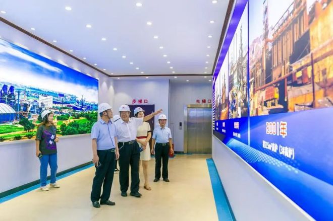 圖為陳玉千一行參觀宏達鋼鐵企業文化展示走廊