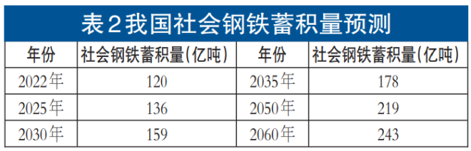 社會鋼鐵蓄積量是反映一個國家工業化程度的重要指標。鋼鐵發展初期是鋼鐵的蓄積,通過鋼鐵產品流動、鐵資源空間轉移而實現。從更廣闊的視角看,鐵資源流動是從地下向地上的流動、從國外向國內的流動、從南半球向北半球的流動。未來,鋼鐵發展到一定程度後,將不再以上述3個流動為主,將轉變為“鋼鐵的循環”或稱“鐵資源的循環”——製造領域是鐵資源的短周期循環,建築領域是鐵資源的長周期循環。據預測,2022年我國社會鋼鐵蓄積量為120億噸,2035年將達到178億噸,2050年將達到219億噸,2060年將達到243億噸(見表2)。