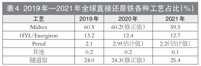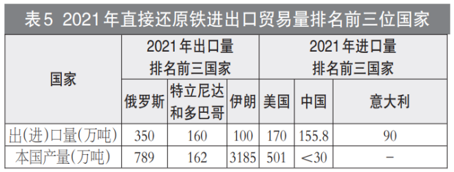 2021年,全球直接還原鐵貿易量增至創紀錄的2280萬噸,其中陸路運輸貿易總量超過1480萬噸,比2020年增長4.4%。2021年,直接還原鐵主要出口國分別為俄羅斯、特立尼達和多巴哥、伊朗、印度、美國;有38個國家進口直接還原鐵和熱壓塊鐵,居前3位的是美國、中國和意大利(見表5)。