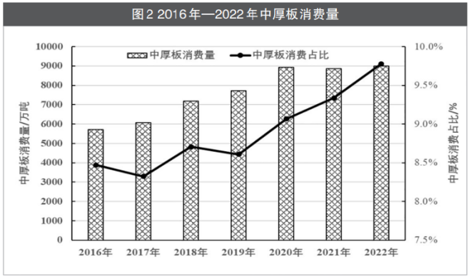 消費量。“十三五”以來,我國中厚板消費量保持快速增長,扣除重複材,中厚板實際消費量由2016年的5700萬噸快速增長至2022年的9000萬噸,2016年—2022年年均增速達到7.9%,遠高於鋼材消費量5.4%的增速。中厚板消費量占鋼材消費總量的比例由2016年的8.5%提升至2022年的9.8%,提高了1.3個百分點。