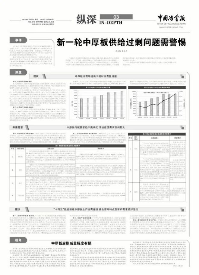 產量。“十三五”以來,我國中厚板(含特厚板、厚鋼板、中板,下同)產量穩步增長,由2016年的6920萬噸增至2022年的9647萬噸,2016年—2022年年均增速達到5.7%。同時,一大批高端品種研發生產實現重大突破,如鞍鋼航母甲板用鋼、舞鋼177.8毫米海洋平台用齒條鋼A514GrQ和大厚度臨氫鉻鉬鋼、寶武690兆帕級橋梁鋼Q690qENH、南鋼9Ni鋼等,為國家重點項目、重大工程及國防建設提供了有力支撐。