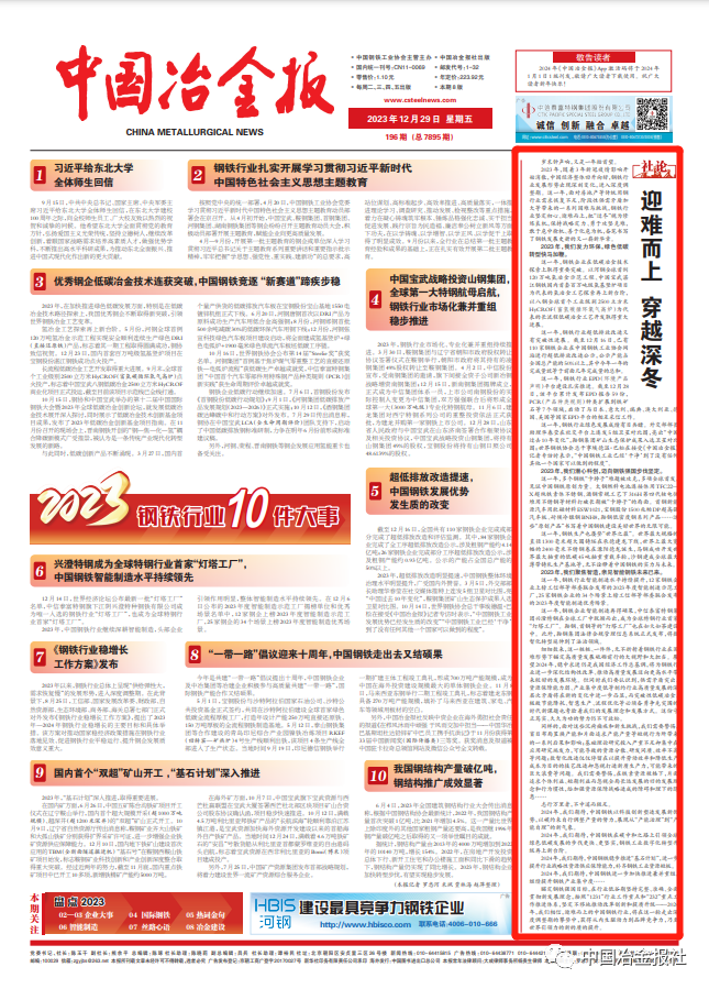 2024年,我們期待,中國鋼鐵在碳中和之路上引領全球綠色低碳發展的步伐更快、更堅實,鋼鐵工業數字化轉型升級再上新台階。