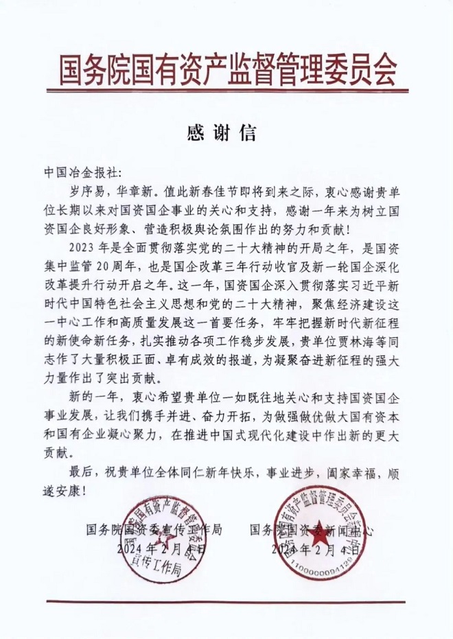 國務院國資委宣傳工作局、國務院國資委新聞中心向中國冶金報社發來感謝信