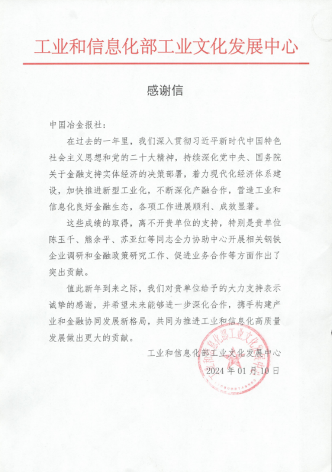 工信部工業文化發展中心、鞍鋼集團、包鋼集團向中國冶金報社發來感謝信