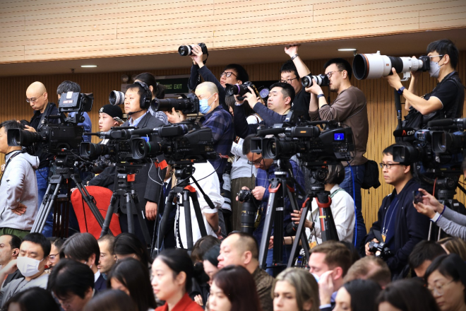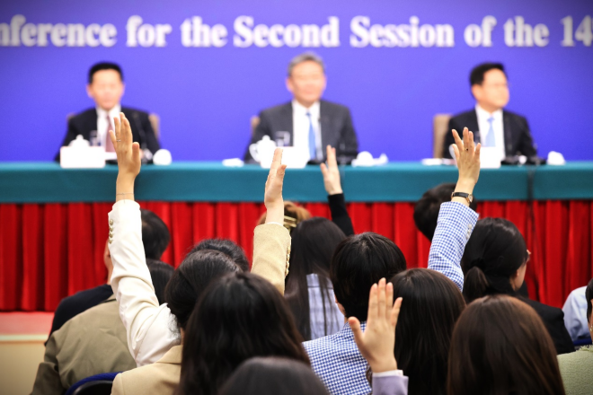 3月6日,十四屆全國人大二次會議在北京梅地亞中心新聞發布廳舉行記者會。國家發展和改革委員會主任鄭柵潔、財政部部長藍佛安、商務部部長王文濤、中國人民銀行行長潘功勝、中國證券監督管理委員會主席吳清就發展改革、財政預算、商務、金融證券等相關問題回答中外記者提問