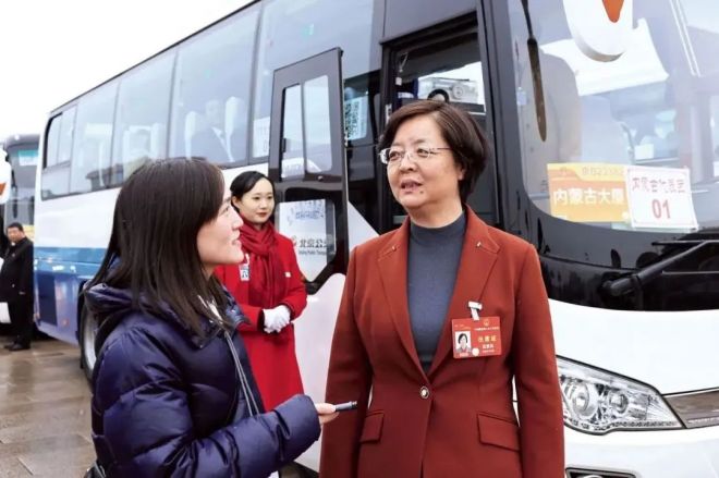 圖為3月5日,全國人大代表,包鋼集團黨委書記、董事長孟繁英在登車前接受中國冶金報社兩會報道組記者樊三彩的現場采訪。