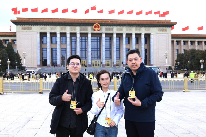 人大閉幕後,中國冶金報社兩會報道組記者顧學超、樊三彩、劉經緯在人民大會堂前合影留念。(工人日報記者 王偉偉 攝)