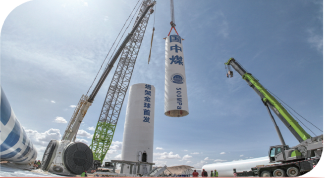圖為4月21日,在新疆哈密戈壁灘上,全球首台套500兆帕高強鋼風電塔架吊裝現場。