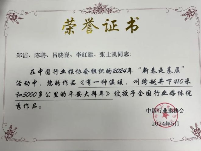 由中國冶金報社記者鄭潔、陳聃、呂曉崑,中國華冶科工集團有限公司通訊員李紅建、張士凱創作的作品《有一種溫暖,叫跨越井下410米和5000多公裏的平安大拜年》被授予全國行業媒體優秀作品;中國冶金報社記者賈林海被確定為全國性行業類媒體先進個人。