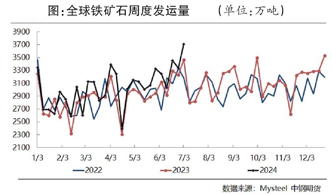 第三階段,2024年5月23日—6月底,宏觀政策處於空窗期,市場交易表現為弱現實,鐵礦石期貨、現(xian)貨(huo)價(jia)格(ge)階(jie)段(duan)性(xing)見(jian)頂(ding)回(hui)落(luo),鐵(tie)礦(kuang)石(shi)供(gong)需(xu)保(bao)持(chi)平(ping)衡(heng)略(lve)寬(kuan)鬆(song)態(tai)勢(shi),需(xu)求(qiu)邊(bian)際(ji)回(hui)升(sheng)預(yu)期(qi)偏(pian)弱(ruo),疊(die)加(jia)宏(hong)觀(guan)政(zheng)策(ce)空(kong)窗(chuang)期(qi),港(gang)口(kou)鐵(tie)礦(kuang)石(shi)庫(ku)存(cun)水(shui)平(ping)居(ju)曆(li)史(shi)同(tong)期(qi)高(gao)位(wei),限(xian)製(zhi)鐵(tie)礦(kuang)石(shi)價(jia)格(ge)上(shang)行(xing)空(kong)間(jian),鐵(tie)礦(kuang)石(shi)價(jia)格(ge)不(bu)斷(duan)走(zou)低(di)。