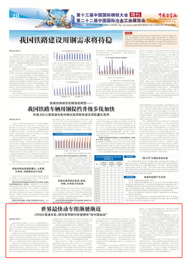 “要想實現時速400公裏運行,不僅對列車有要求,對高鐵線路也有要求。目前正在修建中的成渝中線高鐵,設計時速350公裏,在部分區段預留進一步提速條件。”當《中國冶金報》記者將上述有關報道內容發給這位專家時,他說,目前不太了解其中的情況。不過,他認為,CR450工程對時速400公裏高鐵線路的高要求有可能重點不在鋼軌上,可能在整個高鐵線路的平直度及曲徑、橋梁、隧道等基礎設計上。
