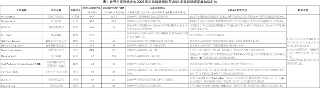 疫情之後,在部分國家政府長期碳減排目標可信度下降、部分關鍵行業(比如石油天然氣)出現“承諾倒退”的情況下,鋼鐵企業的低碳發展動態更顯可貴、睿智、深謀遠慮。本文彙總並分析了全球超過35家頭部鋼鐵企業的可持續發展動向,特別是他們在減少碳排放和推動綠色技術研發方麵的最新舉措。數據源自各大鋼鐵企業的官方網站、上市公司公告、環境責任報告等,旨在提供一個詳盡而精確的綜述。這些數據包括2023年各公司的粗鋼產量、既有的遠期承諾目標,以及2024年以來的最新動向,特別關注各企業在“範圍1”和“範圍2”排放方麵的最新情況。