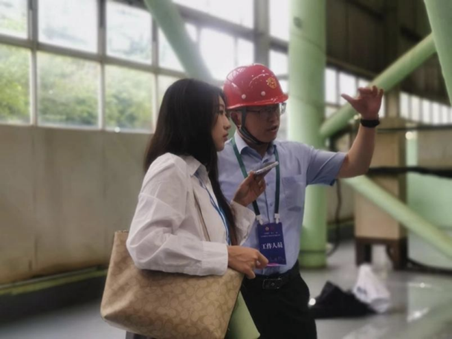 圖為陳超向《中國冶金報》記者介紹賽場情況。