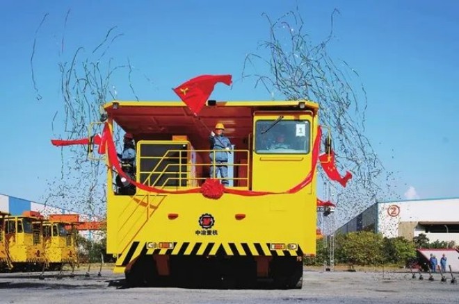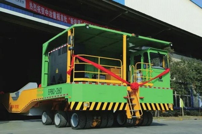 圖為中冶寶鋼“中冶重機”品牌260噸電驅鐵水車下線現場。
