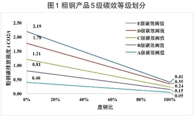 第三,等組分類體係,以廢鋼加入比例滑動計算,廢鋼加入比例越高,相應等級分類閾值也越低(圖1),以鼓勵鋼廠采取添加廢鋼之外的減碳技術。