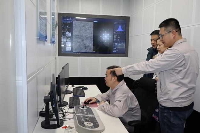 圖為劉旭明(右一)在透射電鏡前向《中國冶金報》記者介紹取向矽鋼樣品的微觀結構和氮化鋁抑製劑的分布形態。