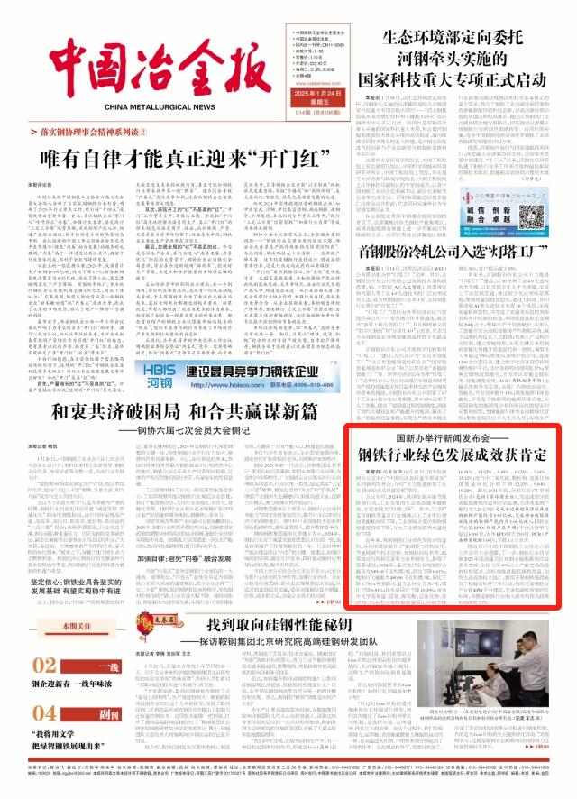 近年來,我國鋼鐵行業綠色發展步伐加快,在環保績效提升、產能調控與結構優化、節能降碳與技術創新、廢鋼鐵回收利用、政策推動與機製完善等方麵多措發力,取得了顯著成效:2024年,重點統計企業噸鋼綜合能耗為549.68千克標煤/噸,同比下降0.61%;噸鋼可比能耗為480.96千克標煤/噸,同比下降1.75%;噸鋼取水量為2.33立方米/噸,同比下降0.81%;排水量同比下降10.39%,廢水中化學需氧量、氨氮、揮發酚、總氰化物、懸浮物、石油類汙染物排放量同比分別下降16.91%、19.52%、5.49%、10.25%、7.64%、33.12%;廢氣中二氧化硫、顆粒物、氮氧化物排放量同比分別下降12.23%、9.84%、10.22%。截至2024年底,全國共有171家鋼鐵企業(包括1家球團企業),完成或部分完成超低排放改造和評估監測,共涉及粗鋼產能約為7.21億噸(完成全過程超低排放改造的粗鋼產能約為5.53億噸,完成部分超低排放改造的粗鋼產能約為1.68億噸);鋼鐵全產業鏈EPD(環境產品聲明)平台注冊單位超過6100家,發布EPD報告210份、PCR(產品種類規則)14份,下載5.1萬餘次
