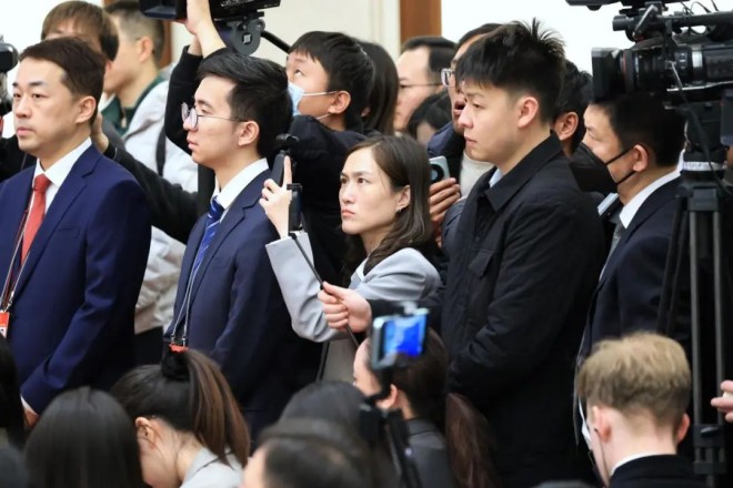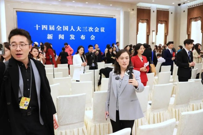 中國冶金報社兩會報道組記者樊三彩(中)在新聞發布會上拍攝小視頻報道