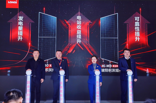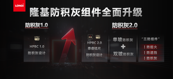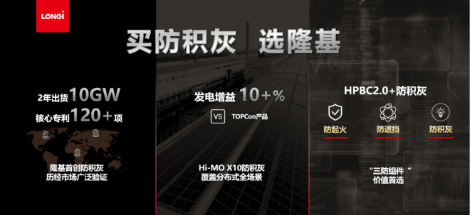 3月5日,隆基綠能在第二十屆中國(濟南)國際太陽能利用大會暨第四屆中國(山東)新能源與儲能應用博覽會上發布基於HPBC2.0技術的防積灰組件——Hi-MO X10防積灰組件,最高功率可達670W,轉化效率高達24.8%,疊加隆基在行業內首創的防積灰技術,單位麵積理論發電量較常規TOPCon組件高出10%以上。