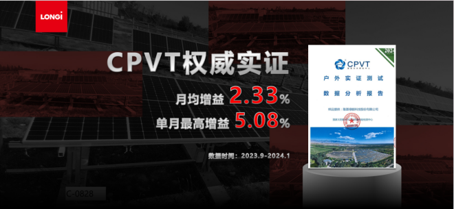 國家光伏質檢中心(CPVT)作為我國首個國家級光伏產品法定檢驗機構,在位於銀川的戶外實證基地對隆基防積灰組件的發電性能和衰減進行了實測。通過7個月(2023年9月至2024年3月)的實測數據得知,隆基BC防積灰組件較常規BC組件月均相對增益2.33%,最高月相對增益5.08%,最高單日增益達10%以上。