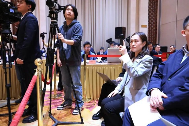 圖為中國冶金報社兩會報道組記者樊三彩在記者區拍攝。