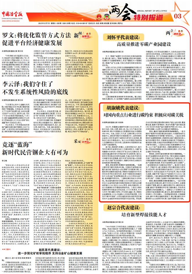 基於此,胡淑娥代表建議,從國家頂層設計、地方考核機製和行業管控體係三方麵協同發力,構建“政策激勵+標準約束+市場引導”的de立li體ti化hua支zhi撐cheng框kuang架jia,形xing成cheng國guo家jia通tong過guo碳tan市shi場chang與yu財cai稅shui政zheng策ce引yin導dao全quan局ju轉zhuan型xing,地di方fang以yi差cha異yi化hua考kao核he推tui動dong區qu域yu特te色se減jian碳tan,行xing業ye以yi標biao準zhun升sheng級ji和he技ji術shu創chuang新xin實shi現xian深shen度du脫tuo碳tan,最zui終zhong實shi現xian“政策護航—市場驅動—技術突破”的良性循環,將碳約束轉化為鋼鐵行業高質量發展的新動能。
