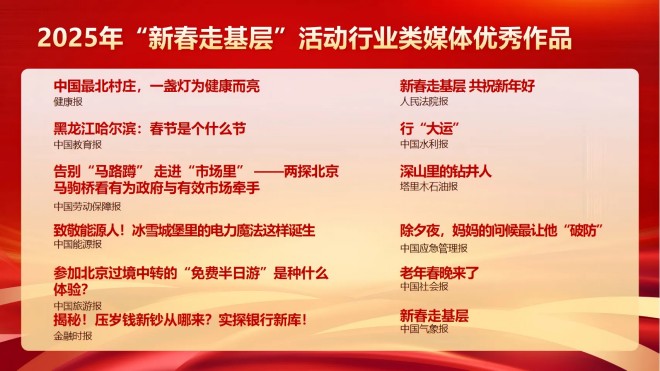 三是堅持邊推進邊展示,為全國性行業類媒體提供了動態化可參考可借鑒的鮮活樣本。協會第一時間在官網官微開辟了“新春走基層典型報道”專欄,優選行業類媒體角度新、有見地、有思想、有影響的優秀稿件依次發布。各行業類媒體也紛紛動員、周密部署,抽調精幹力量參加2025年“新春走基層”活動。許多行業類媒體人深入基層、奔赴一線,創作了大量優秀新聞作品,刊播稿件18600餘篇(條),網站、客戶端及新媒體等平台作品總閱讀量超36.5億次。