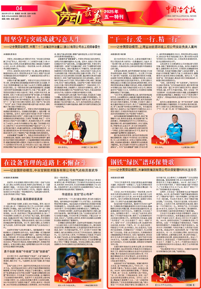 王存誌,2022年榮獲全國五一勞動獎章、2020年榮獲天津市勞動模範稱號,2023年當選中國工會第十八次全國代表大會代表,2025年榮獲全國勞動模範稱號。他與天津鋼鐵集團的故事,是鋼鐵與綠色交織、個人責任與企業創新交融的讚歌。