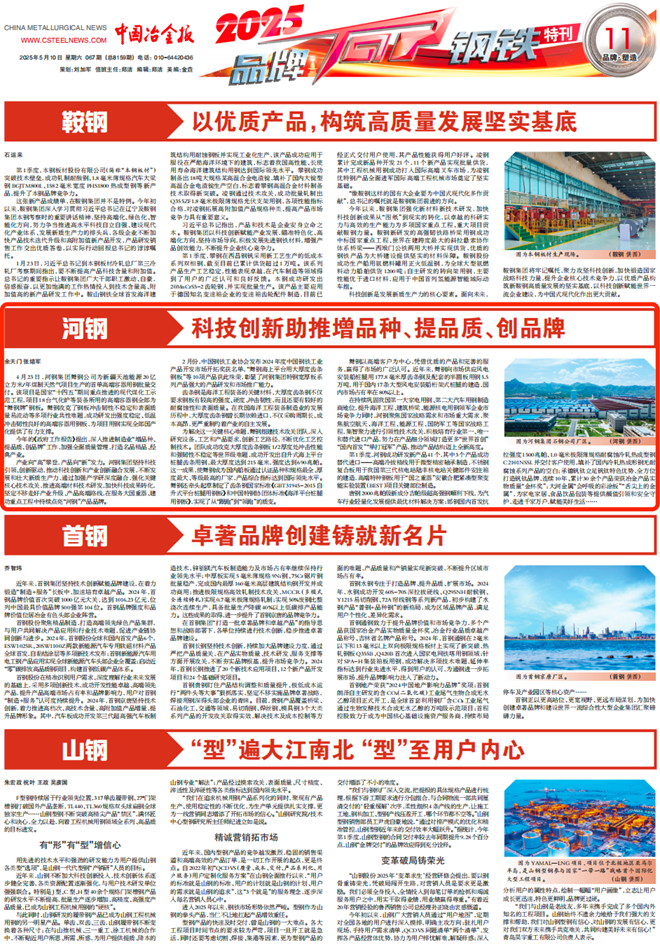 唐鋼2000兆帕級新成分吉帕級超高強鋼順利下線,為汽車行業輕量化發展提供最優材料解決方案;邯鋼國內首發抗拉強度1500兆帕、1.0毫米極限薄規格耐腐蝕冷軋熱成型鋼C2101NSSL並交付客戶使用,填補了國內冷軋熱成形鋼無耐腐蝕係列產品的空白;承德釩鈦立足釩鈦特色優勢,全方位打造釩鈦品牌,連續10年、累計30餘個產品榮獲冶金產品實物質量“金杯獎”;大河金屬“會呼吸的彩塗板”“舌尖上的金屬”,為家電家居、食品飲品包裝等提供顏值引領和安全守護,走進千家萬戶,賦能美好生活……(餘天門 張培軍)