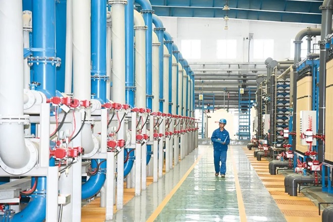 河鋼集團石鋼公司以城市中水為主要水源,在國內鋼鐵行業率先實現了廢水100%循環利用。圖為石鋼水處理車間。