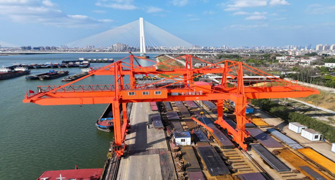 湘鋼順祥碼頭正在作業。(賀意波 拍攝)